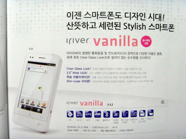 Корейский техноблог Cetizen опубликовал накануне фотографии рекламных материалов первых "андроидных" гаджетов от iRiver. Белый смартфон под названием Vanilla работает на уже устаревающей прошлогодней версии Android 2.2, оснащен 3,5-дюймовым экраном с разрешением 480 на 800 точек, полным комплектом беспроводных интерфейсов и 4 гигабайтами памяти для хранения данных. Скорость процессора, установленного в смартфоне, не сообщается.