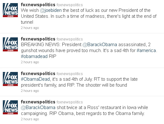омпьютерные взломщики приготовили американцам оригинальный "подарок" на День независимости - 4 июля. Получив доступ к аккаунту телекомпании Fox News в Twitter, хакеры разместили там фальшивые сообщения об убийстве президента США Барака Обамы.